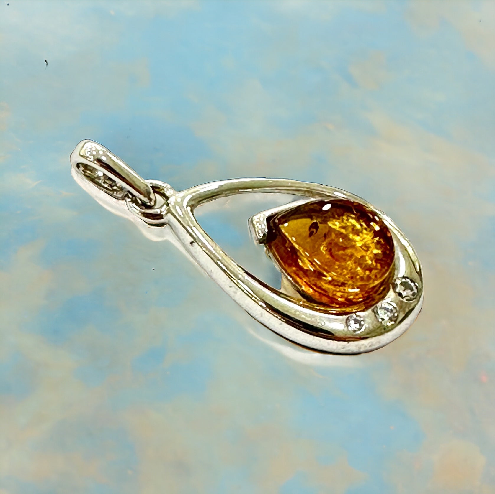 Pendentif argent 925 rhodié et Ambre de la Baltique avec 3 petits oxyde de zirconium
